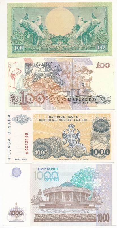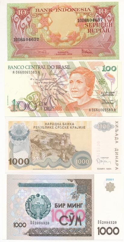 Brazil ND (1990) 100 Cruzeiros + Croatia / Serb Republic of Krajina 1994. 1000 Dinara + Indonesia 1959. 10 Rupiah + Uzbekistan 2001. 1000 So'm C:UNC,AU