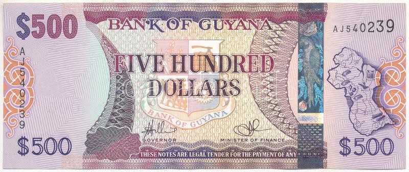 Guyan... https://www.darabanth.com/hu/423-Gyorsarveres/423.0/Numizmatika/Kulfoldi-bankjegyek~6000014/Guyana-DN-2011-2018-500USD-AJ-540239-TIII-kis-folt-Guyana-ND-2011-2018-500-Dollars-AJ-540239~II2688861