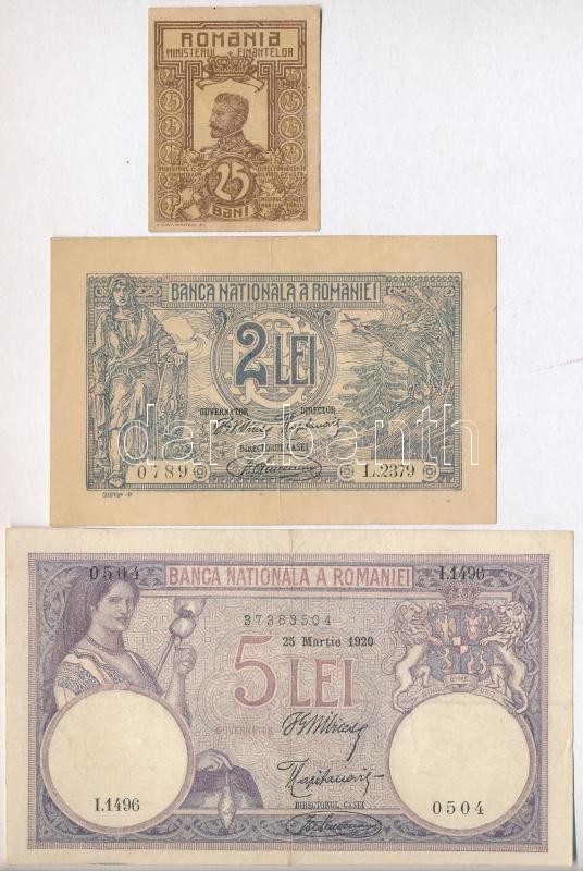 Romania 19... https://www.darabanth.com/hu/423-Gyorsarveres/423.0/Numizmatika/Kulfoldi-bankjegyek~6000014/Romania-1917-25b-plus-1920-2L-plus-5L-TIII-kis-szakadas-folt-Romania-1917-25-Bani-plus-1920-2-Lei-plus-~II2687566