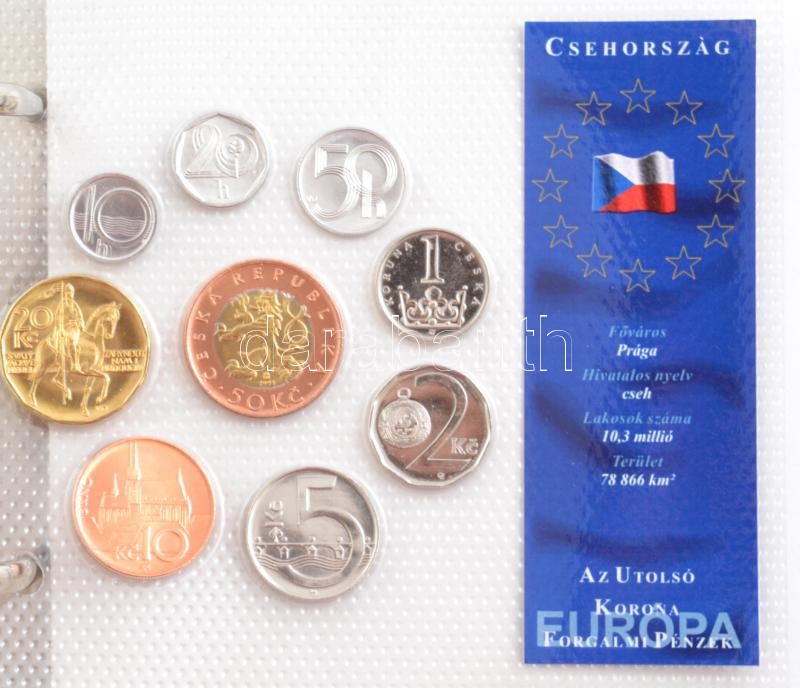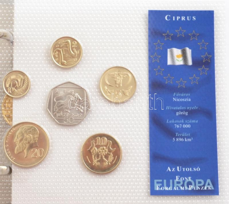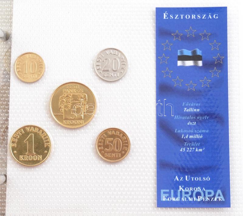 "Európa utolsó pénzei" gyűrűs érmetartó album, benne "Európa utolsó pénzei" vákuumcsomagolt forgalmi szettek (21x, ebből 20xklf). Benne: Ausztria, Belgium, Ciprus, Csehország, Észtország, Finnország, Franciaország, Görögország, Hollandia (2xklf), Írország, Lengyelország, Lettország, Litvánia, Luxemburg, Magyarország, Málta, Németország, Olaszország, Portugália, Spanyolország, Szlovákia, Szlovénia T:1-2 "Europe's last coins" coin holder album coin sets in factory sealed vacuum sheets (21x among the 20xdiff) with: Austria, Belgium, Cyprus, Czech Republic, Estonia, Finland, France, Greece, Netherlands (2xdiff), Ireland, Poland, Latvia, Lithuania, Luxembourg, Hungary, Malta, Germany, Italy, Portugal, Spain, Slovakia, Slovenia C:UNC-XF