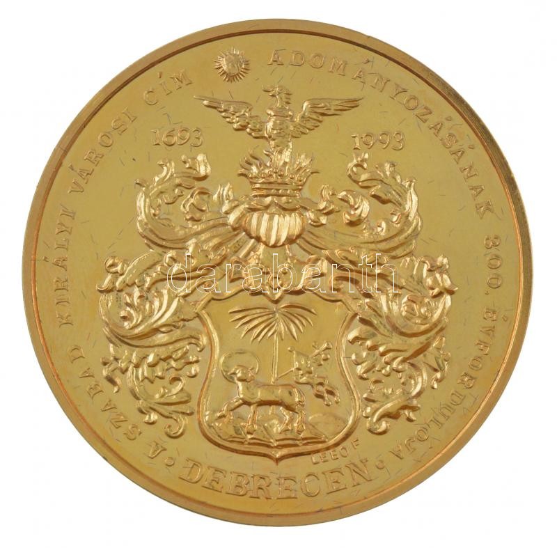 Lebó Ferenc (1960-) 1993. "Debrecen - A szabad királyi városi cím adományozásának 300. évfordulója / Lipót tallér" aranyozott emlékérem műanyag tokban (42,5mm) T:1