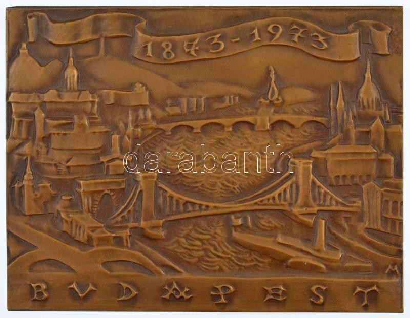 Leírás: Madarassy Walter (1909-1994) 1973. "Budapest 1873-1973" egyoldalas, öntött bronz plakett dísztokban (78x101mm) T:1