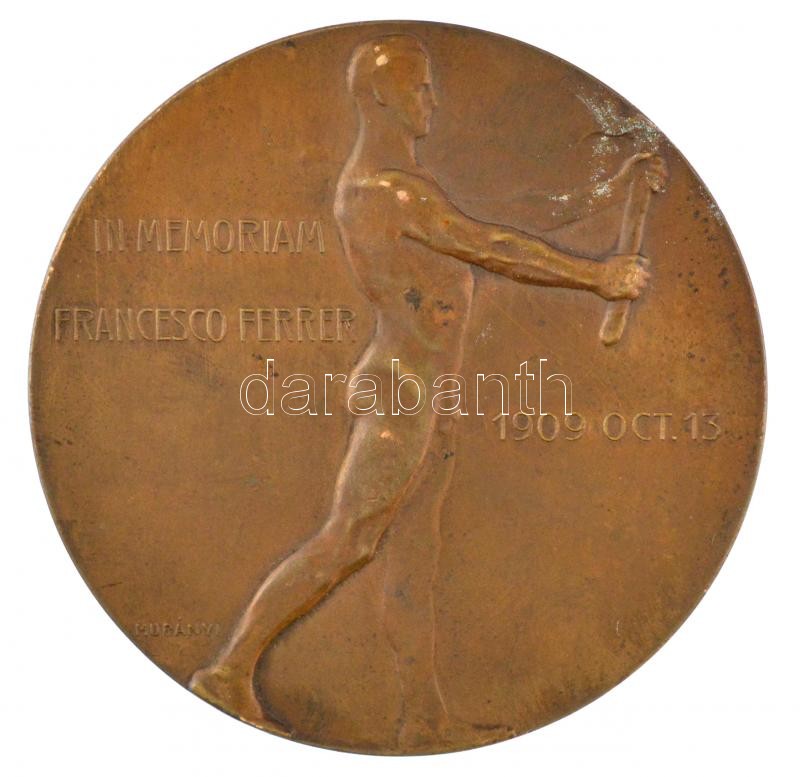 Leírás: Murányi Gyula (1881-1920) 1909. "Francesco Ferrer emlékére" Br emlékérem. "IN MEMORIAM FRANCESCO FERRER 1909 OCT. 13" (50mm) T:1-,2 HP 3691.
