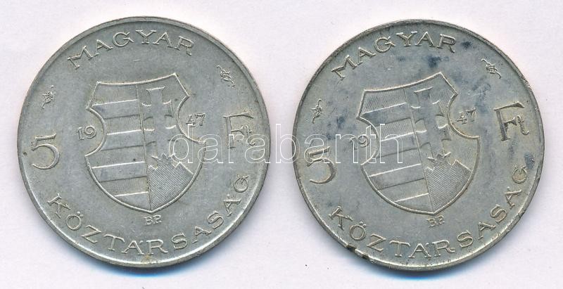 1947. 5Ft Ag "Kossuth" (2x) T:1-,2 Adamo F8.1 https://www.darabanth.com/hu/423-Gyorsarveres/423.0/Numizmatika/Magyar-es-magyar-verdejelu-fem-es-ezustpenzek~6000008/1947-5Ft-Ag-Kossuth-2x-T1-2-Adamo-F81~II2686103