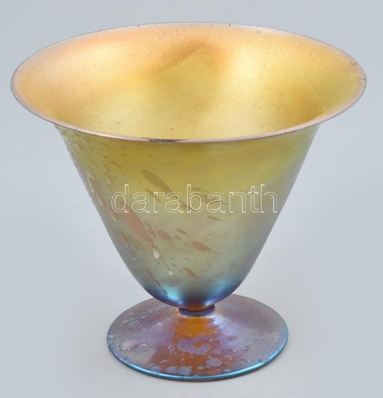 Leírás: Art Deco kehely. Fúvott üveg, felületén irizáló díszítmény. Jelzés nélkül. Peremén apróbb lepattanás. Német, WMF., Geisslingen, Myra sorozat, 1930 körül. d: 15 cm (Felületén gyertya visz maradványok)