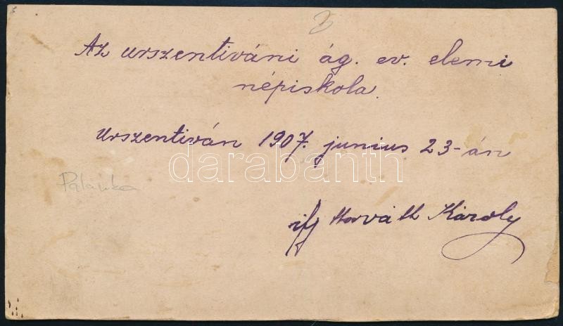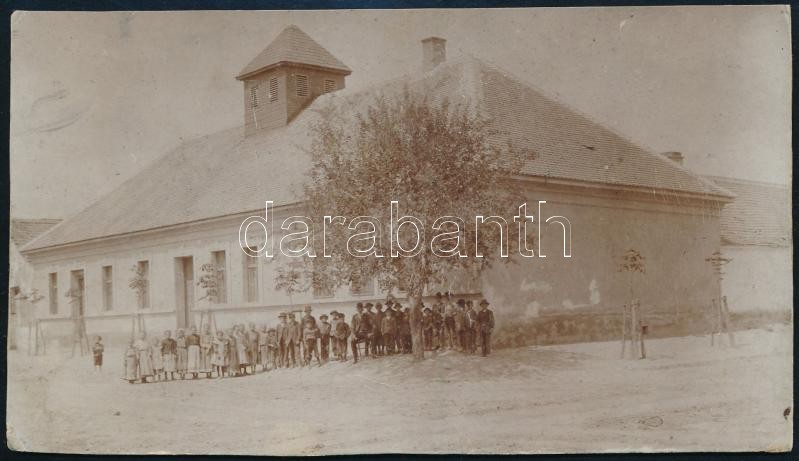 Leírás: 1907 Urszentiván (Úriszentiván / Despotovo, Szerbia), evangélikus elemi népiskola, keményhátú fotó, hátoldalán feliratozott, 16x9 cm