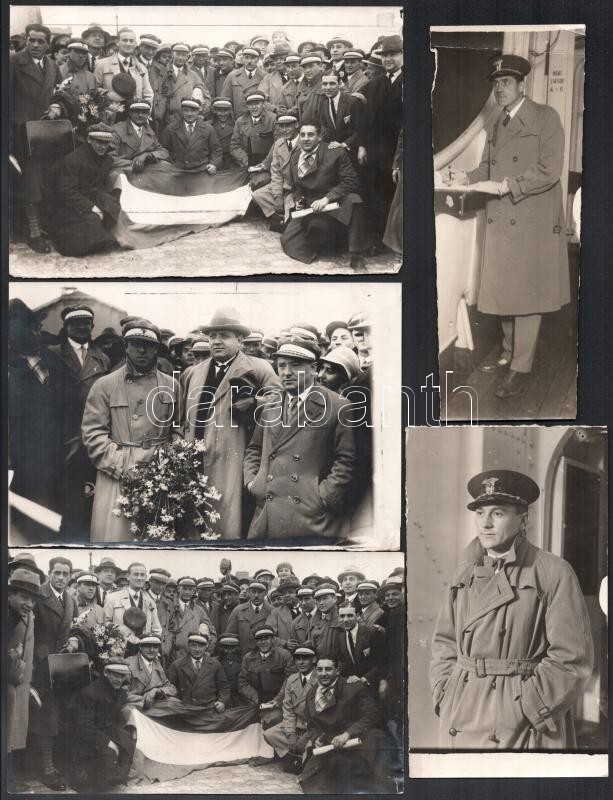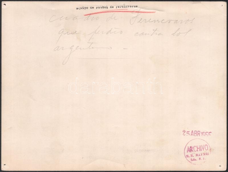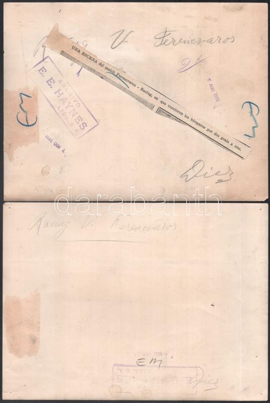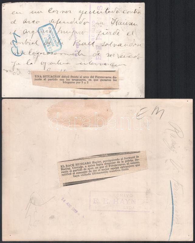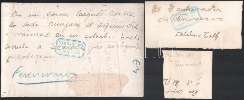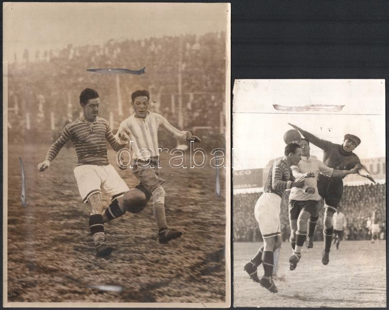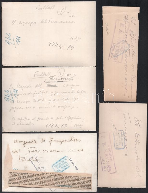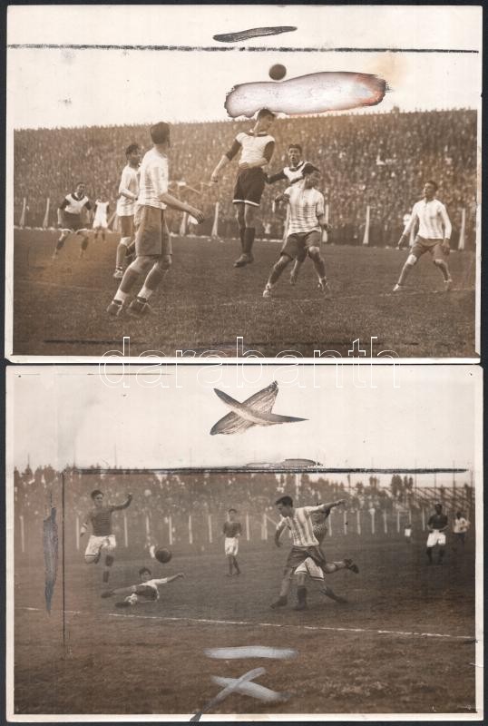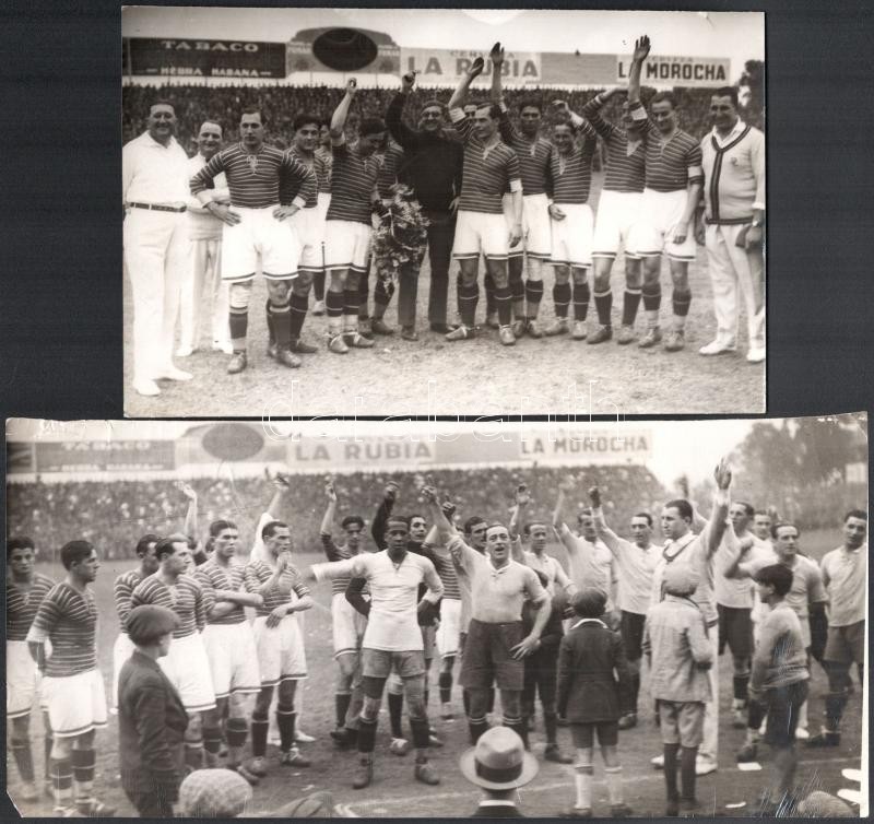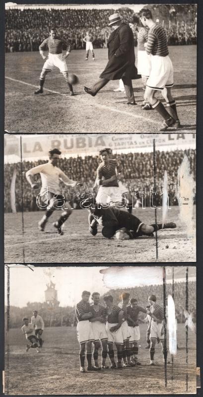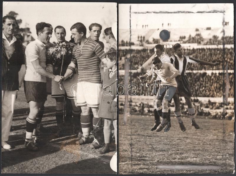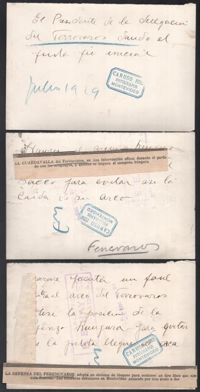 1929 Az Uruguay-Ferencváros (2:3) legendás labdarúgó mérkőzés 38 db eredeti fotója. 18x24 cm-ig Nagyrészt portugál nyelven feliratozva hátul. Közötte a 12 magyar játékos nevesített fotója, valamint a meccs és kezdetének képei. Az 1920-as évek volt a Ferencváros aranykora. 1929-ben a Fradi már minden létező tornát megnyert Magyarországon és Európában is. A KEK győzelem után elhatározták, hogy a legnagyobb futball nemzettekkel is összemérik tudásukat, hogy bemutassák, hogy nem csak a véletlenek szerencsés sorozata miatt jutottak el idáig. Ezért 1929-ben a világ akkori legjobb csapatával, a világbajnok Uruguayjal mérték össze tudásukat Montevideoban. A mérkőzés, mely bevonult a futballtörténelem legemlékezetesebb meccsei közé, az FTC győzelmével végződött. A csapatot a helyszínen rengeteg magyar emigráns biztatta és az uruguayi sajtó is elismerően írt a magyar játékosokról, akiket a korabeli újságírók elsőként Aranycsapat néven kezdtek emlegetni. Futballtörténeti ritkaság! / Uruguay-Ferencvaros (2:3) football match 38 original photos with Portugal descriptions on the back. Rare documents of the epic battle between the best European team and the world champion football team.