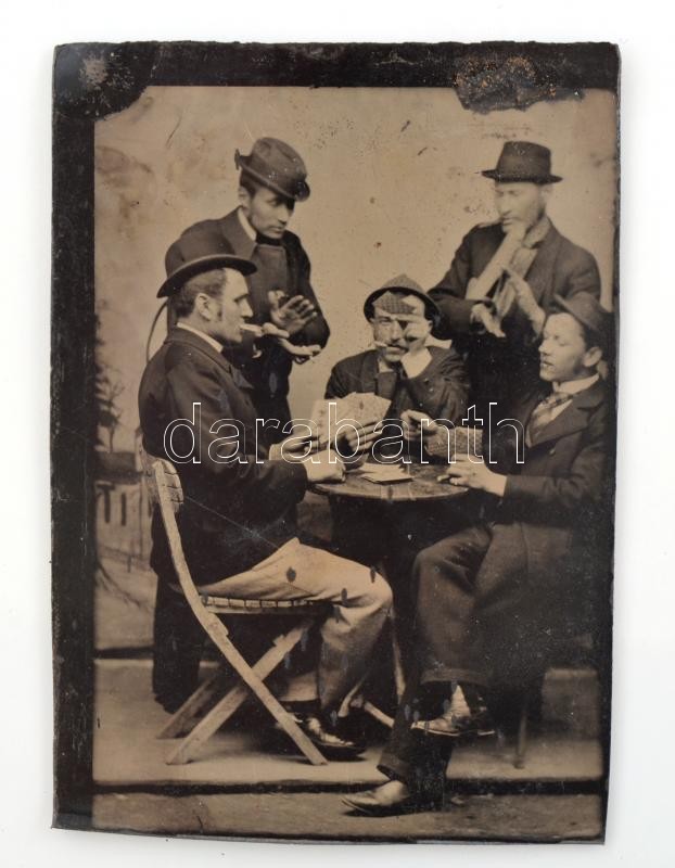 cca 1900 Kártyázó társaság, ferrotípia, 9×6,5 cm https://www.darabanth.com/hu/424-Gyorsarveres/424.0/Fotomuveszet/Foto~500021/cca-1900-Kartyazo-tarsasag-ferrotipia-9C3976-5-cm~II2701577