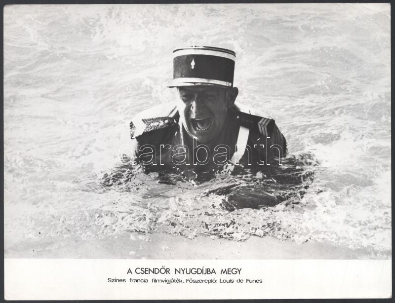 cca 1965 ,,A csendőr nyugdíjba megy" című francia filmvígjáték jelenetei és szereplői (köztük Louis de Funes), 9 db vintage produkciós filmfotó, ezüst zselatinos fotópapíron, a használatból eredő - esetleges - kisebb hibákkal, 18x24 cm