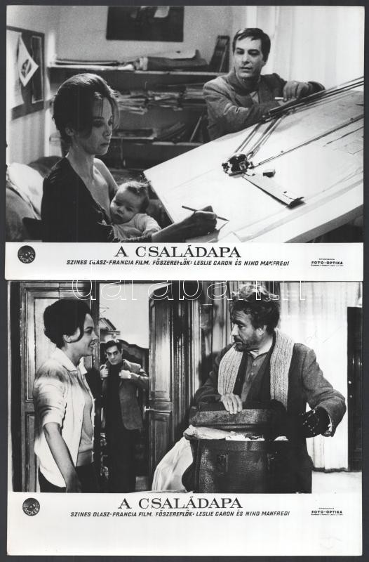 cca 1972 ,,A családapa" című olasz - francia film jelenetei és szereplői (köztük Leslie Caron és Nino Manfredi), 13 db vintage produkciós filmfotó, ezüst zselatinos fotópapíron, a használatból eredő - esetleges - kisebb hibákkal, 18x24 cm