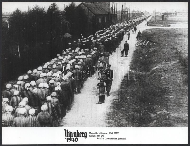 cca 1983 ,,Nürnberg 1946" című magyar dokumentumfilm jelenetei és szereplői, 9 db vintage produkciós filmfotó, ezüst zselatinos fotópapíron, a használatból eredő - esetleges - kisebb hibákkal, 18x24 cm