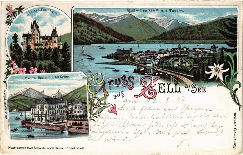 Leírás: 1897 (Vorläufer) Zell am See, Schloss Fischhorn, Central Bad, Hotel Krone. Kunstanstalt Karl Schwidernoch Art Nouveau, floral, litho (EK)