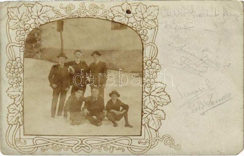 Leírás: 1906 Selmecbánya, Schemnitz, Banská Stiavnica; Diákok télen. Studentika / students in winter. Studentica, Art Nouveau, photo (EM)