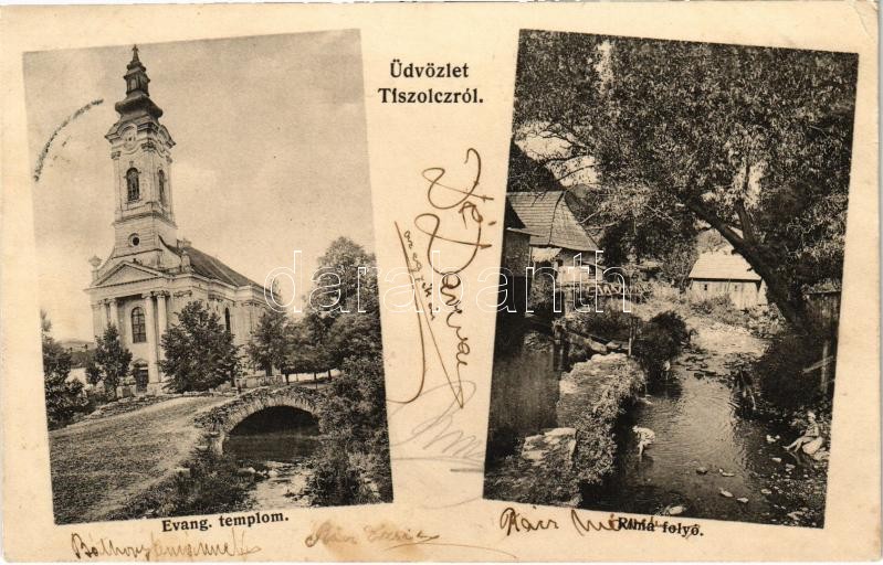 Leírás: 1910 Tiszolc, Tisovec; Evangélikus templom, Rima folyó / Lutheran church, river (EK)
