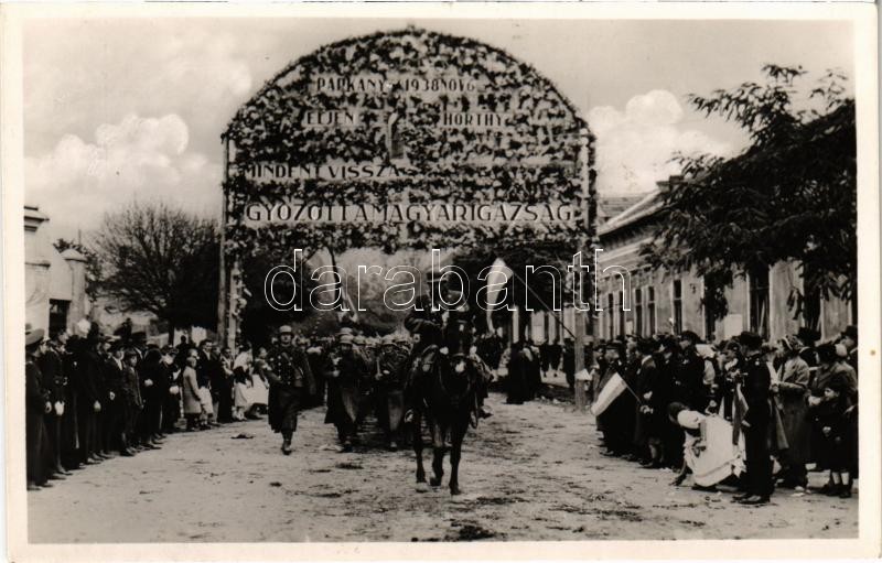 1938 Párkány, Stúrovo; bevonulás, "Éljen Horthy! Mindent vissza! Győzött Magyarország!" díszkapu, magyar zászló / entry of the Hungarian troops, decorated gate, Hungarian flag