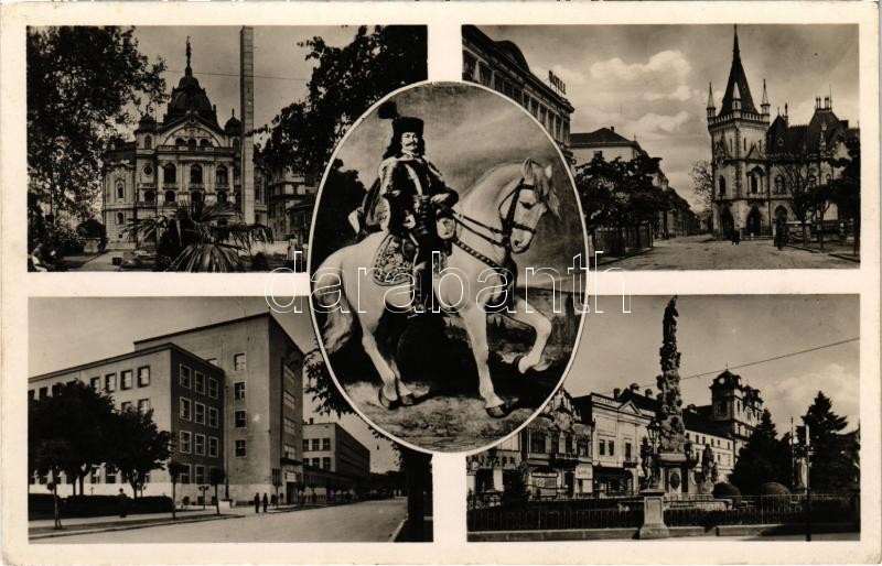 Leírás: 1943 Kassa, Kosice; II. Rákóczi Ferenc fehér lovon, szálloda, üzletek / hotel, shops
