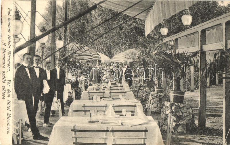 Leírás: 1907 Crikvenica, Cirkvenica; Miramare szálló előtere, étterem kerthelyisége pincérekkel / hotel restaurant, garden with waiters (EK)