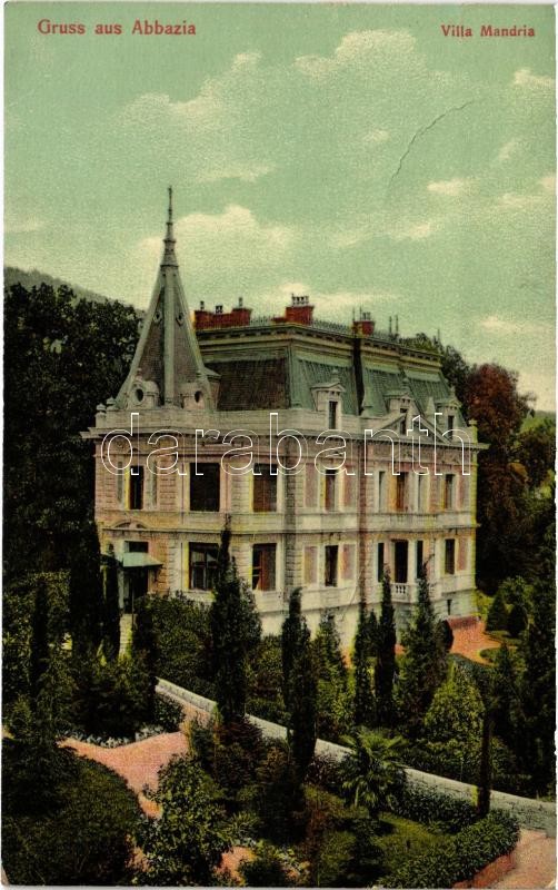 1912 Abbazia, Opatija; Villa Mandria. G. Abucalil No. 13. https://www.darabanth.com/hu/424-Gyorsarveres/424.0/Kepeslapok/Horvatorszag~1000009/1912-Abbazia-Opatija-Villa-Mandria-G-Abucalil-No-13~II2698952