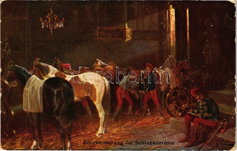 Einquartierung in Schlosskorridor. Offizielle Karte für Rotes Kreuz, Kriegsfürsorgeamt, Kriegshilfsbüro Nr. 87. / WWI Austro-Hungarian K.u.K. military art postcard s: F. Höllerer (EK)