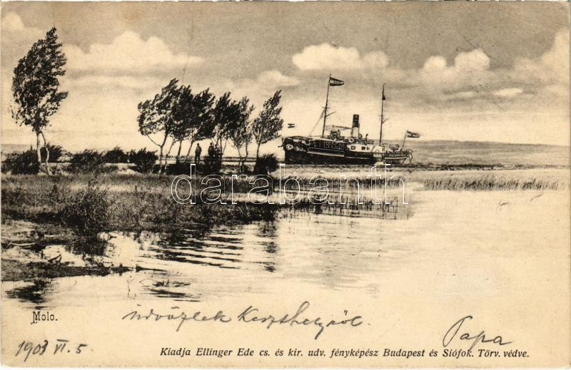 1903 Siófok, Molo, Baross gőzös. Ellinger Ede fényképész kiadása (EK) https://www.darabanth.com/hu/424-Gyorsarveres/424.0/Kepeslapok/Magyarorszag~1000005/1903-Siofok-Molo-Baross-gozos-Ellinger-Ede-fenykepesz-kiadasa-EK~II2698003