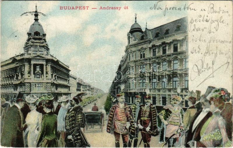 1906 Budapest VI. Andrássy út. Montázs urakkal és hölgyekkel (Rb) https://www.darabanth.com/hu/424-Gyorsarveres/424.0/Kepeslapok/Magyarorszag~1000005/1906-Budapest-VI-Andrassy-ut-Montazs-urakkal-es-holgyekkel-Rb~II2697919
