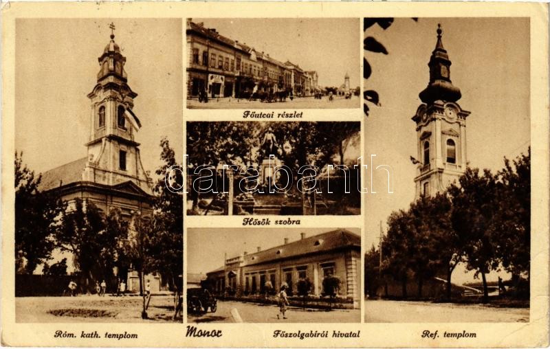 Leírás: 1940 Monor, Római katolikus és református templom, Hősök szobra, Főszolgabírói hivatal, Fő utca (EK)