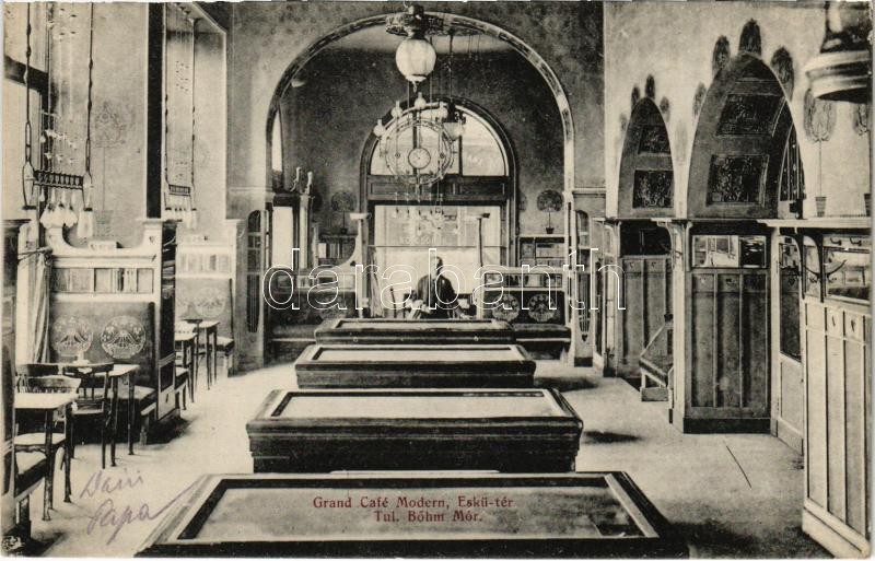 Budapest V. Grand Cafe Modern, kávéház belső (Tulajdonos Böhm Mór), bi... https://www.darabanth.com/hu/424-Gyorsarveres/424.0/Kepeslapok/Magyarorszag~1000005/Budapest-V-Grand-Cafe-Modern-kavehaz-belso-Tulajdonos-Bohm-Mor-biliardasztalok-Esku-tC3~II2699909