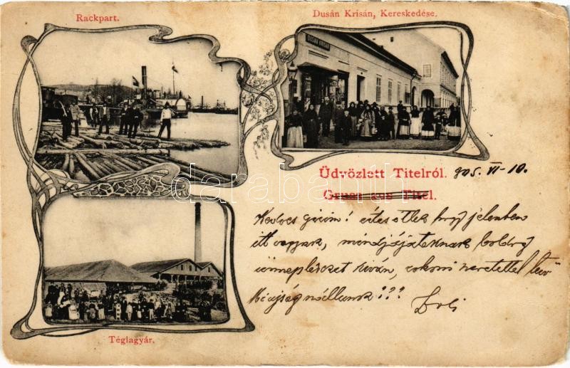 1905 Titel, Gőzhajó állomás, rakpart, "SZONDY" gőzös, Téglagyár, Dusán Krisán kereskedő üzlete / steamship station, port, wharf, quay, brick factory, shop. Art Nouveau, floral (EK)