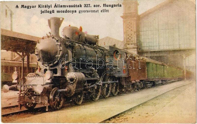 Magyar Királyi Államvasutak 327. sorozatú Hungaria jellegű mozdonya gyorsvonat előtt. Kiadja a Gőzmozdony / Locomotive of the Hungarian State Railways (EK)