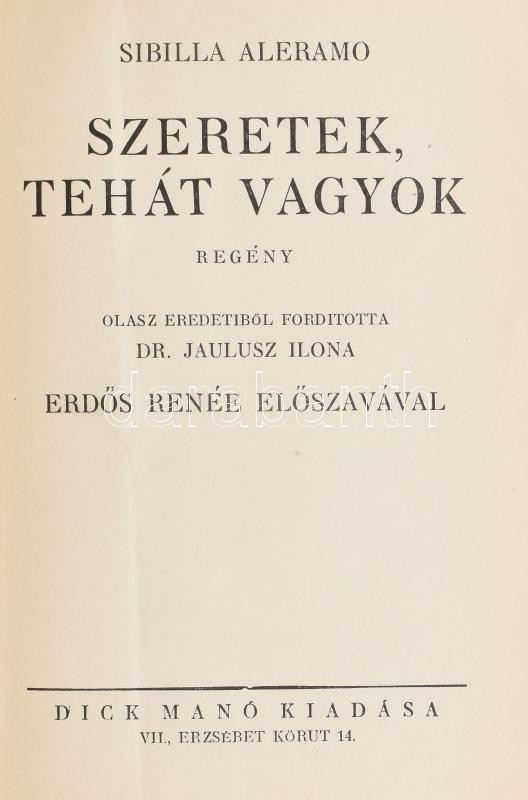 Leírás: Aleramo, Sibilla: Szeretek, tehát vagyok. Ford.: Dr. Jaulausz Ilona. Erdős Renée előszavával. Bp., é.n., Dick Manó, 224 p. Átkötött, aranyozott félvászon-kötésben.