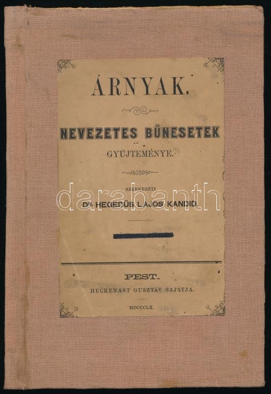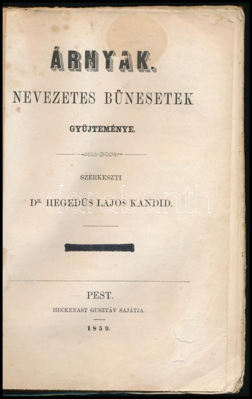 Árnyak. Nevezetes bűnesetek gyűjteménye. Szerk.: Dr. Hegedüs Lajos Kandid. II. köt. Pest, 1859, Heckenast Gusztáv. Átkötött egészvászon-kötésben, átkötéskor az eredeti papírborító egy részét felhasználták, helyenként kissé foltos, sérült lapokkal, nem teljes.