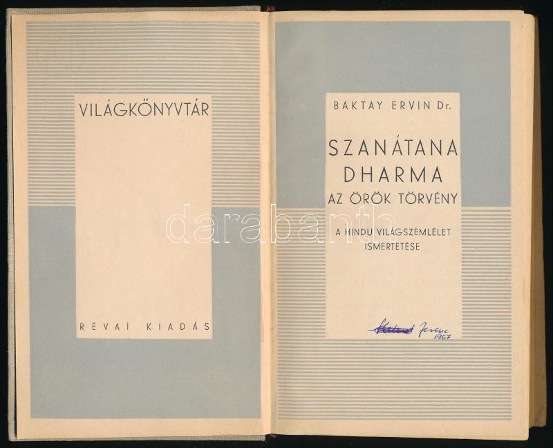 Baktay Ervin: Szanátana Dharma. Az örök törvény. A hindu világszemlélet ismertetése. Világkönyvtár. Bp., [1936], Révai, 283 p. Kiadói egészvászon-kötés, kopottas borítóval, néhány kissé foltos lappal, tulajdonosi névbejegyzéssel.