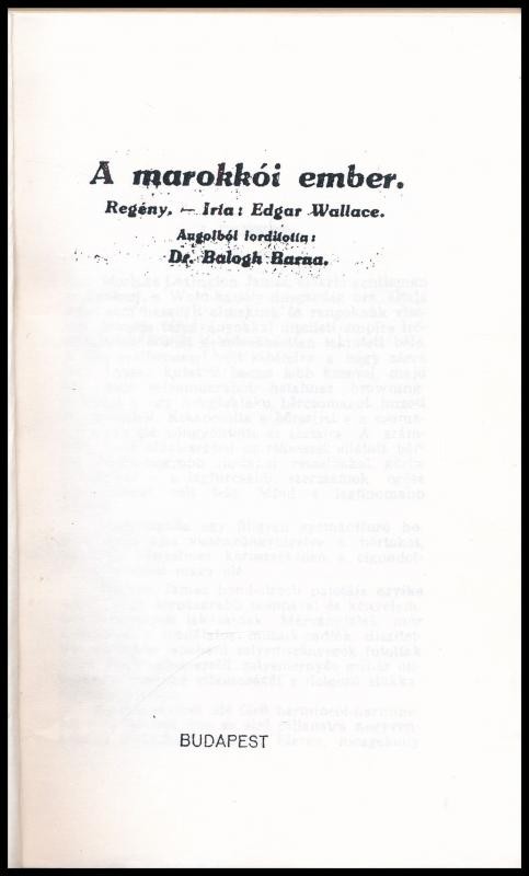 Edgar Wallace: A marokkói ember. Regény. Ford.: Balogh Barna. Kiadói papírkötés. Rendkívül ritka Edgar Wallace regény, igényesen fénymásolt példány. A regény folytatásokban jelent meg a Pesti Hírlapban (Pesti Hirlap, 1929. dec. 10-től (1930) febr. 3-ig (39 részben)), de egyéb magyar nyelvű kiadásnak nincs nyoma.