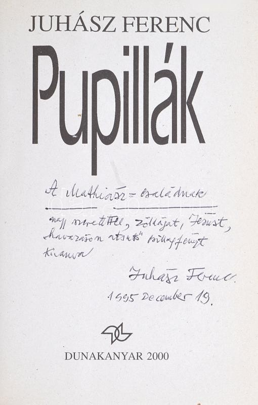 Leírás: Juhász Ferenc: Pupillák. DEDIKÁLT! Bp., 1995., Dunakanyar 2000. Kiadói papírkötés.