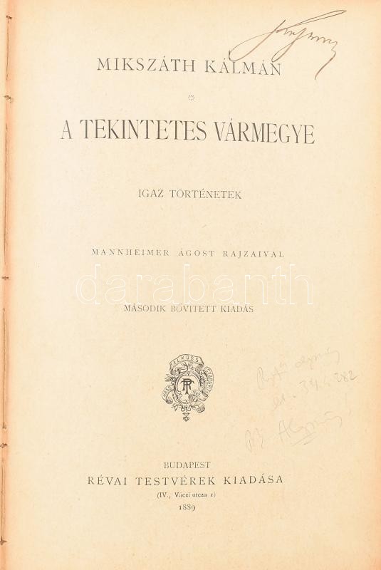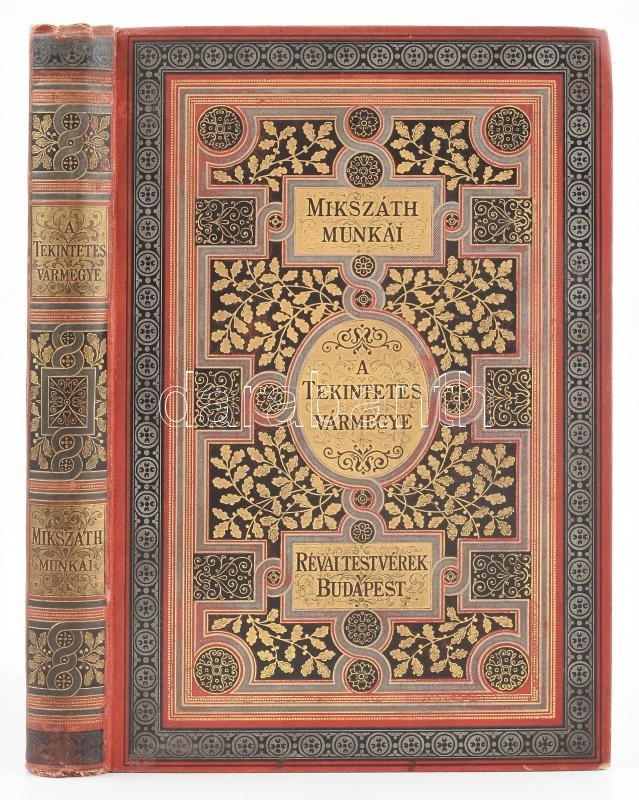 Mikszáth Kálmán: A tekintetes vármegye. Igaz történetek. Mikszáth Kálmán Munkái. Bp.,1889, Révai (Pallas-ny.), (8)+227 p. Második kiadás. Szövegközi és egészoldalas illusztrációkkal. Kiadói aranyozott, festett egészvászon sorozatkötés, kissé sérült gerinccel, néhány kissé foltos lappal, egy lap kijár.