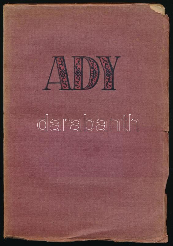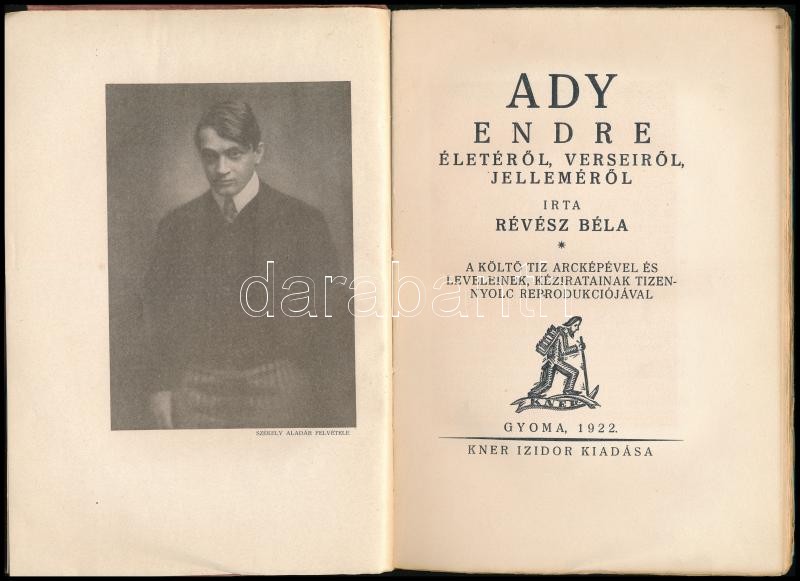 Révész Béla: Ady Endre életéről, verseiről, jelleméről. A költő fényképfelvételeit Székely Aladár készítette. A külső címlapot és a fametszésű könyvdíszeket Kozma Lajos rajzolta. Gyoma, 1922, Kner Izidor, 3 sztl. lev. + 1 t. + 219 p. + 4 sztl. lev. + 9 t. Oldalszámozáson belül a költő leveleinek, kéziratainak reprodukcióival. Kiadói papírkötés, kissé sérült borítóval, az elülső borítón kis sarokhiánnyal. "Készült famentes papíroson 3000, valinpapíroson félvászonkötésben 200, valódi merített papíroson félbőrkötésben 50 példányban."