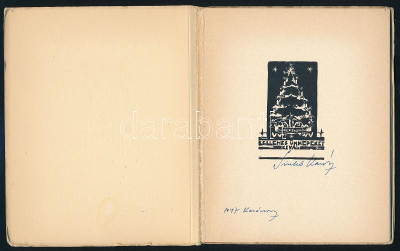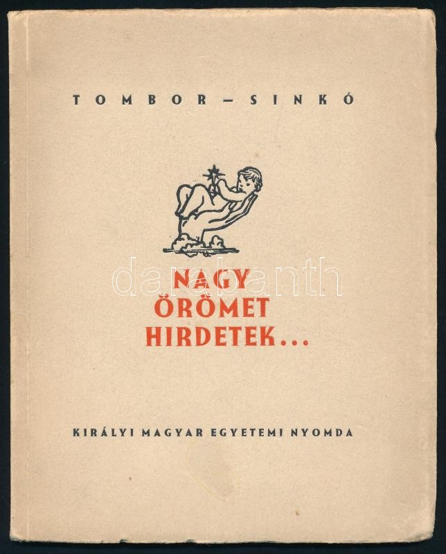 Tombor Tibor-Sinkó Károly: Nagy örömet hirdetek... Tombor Tibor versei, Sinkó Károly fametszetei. Bp., 1937, Kir. M. Egyetemi Nyomda, 25+(3) p. Oldalszámozáson belül Sinkó Károly 7 egészoldalas fametszetével illusztrálva. Kiadói papírkötés. Megjelent 500 példányban. Sinkó Károly (1910-1967) festő, grafikus által DEDIKÁLT példány.