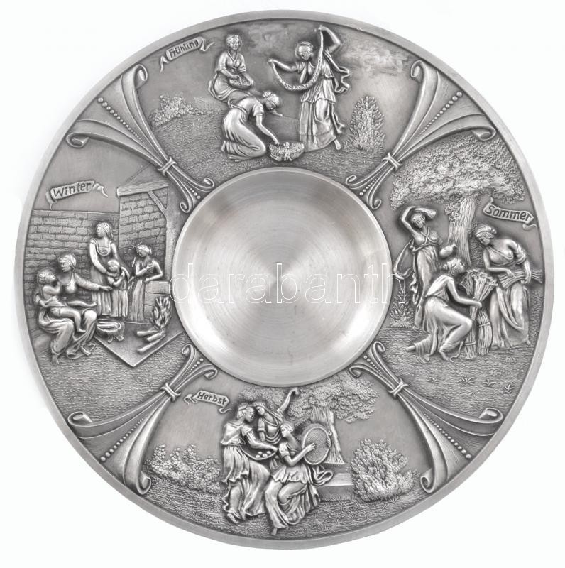 Leírás: 4 évszak jelenetes, német, ón, dísz tál, jelzett, hibátlan, d: 23 cm