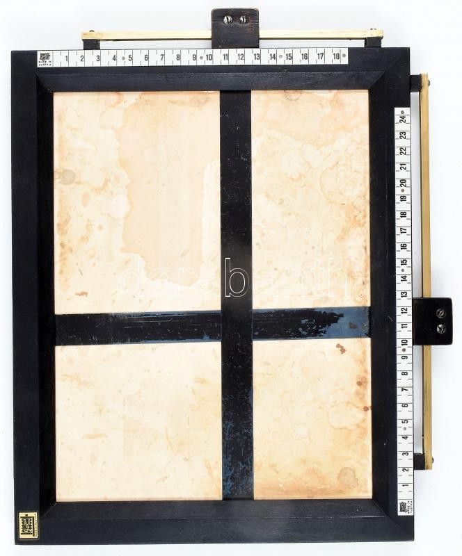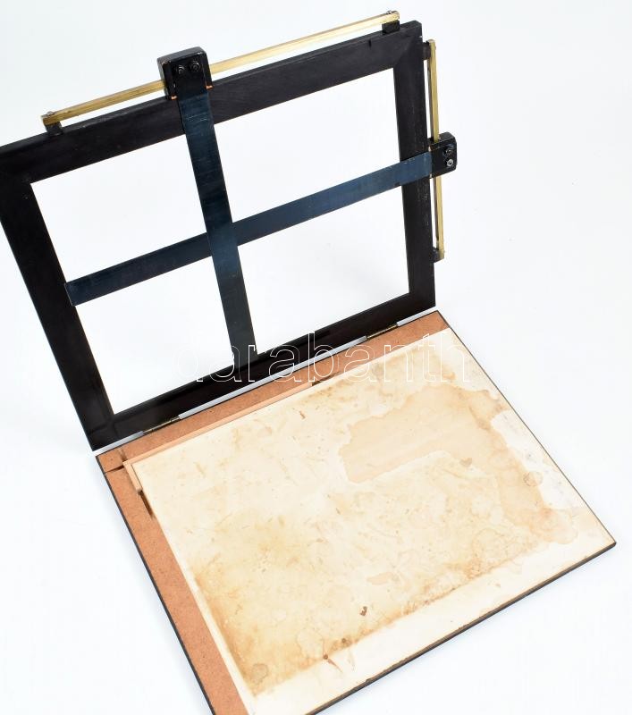 Leírás: Faltus osztrák gyártmányú vonalzós rajztábla, fa és fém, felnyitható, kopásnyomokkal, foltokkal, 33,5x27,5 cm
