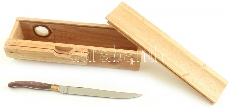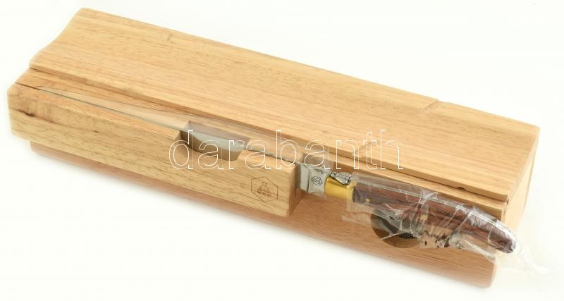 Leírás: Kolbásztartó fadoboz Laguiole márkájú késsel, szép állapotban, 33x10x7cm