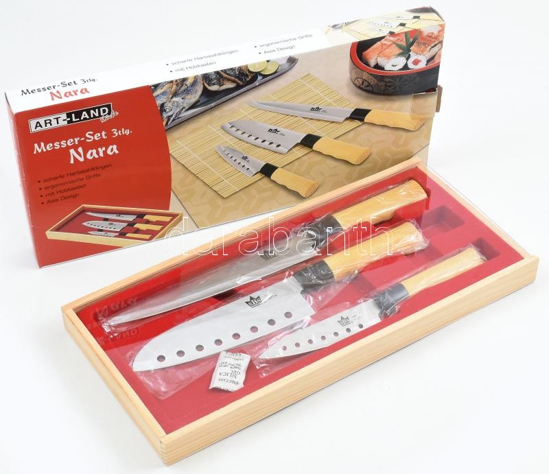Leírás: Nara inox konyhai kés szett, 3 db, fa tokban, használatlan állapotban, eredeti dobozában