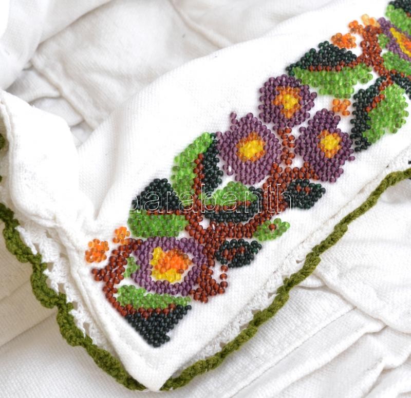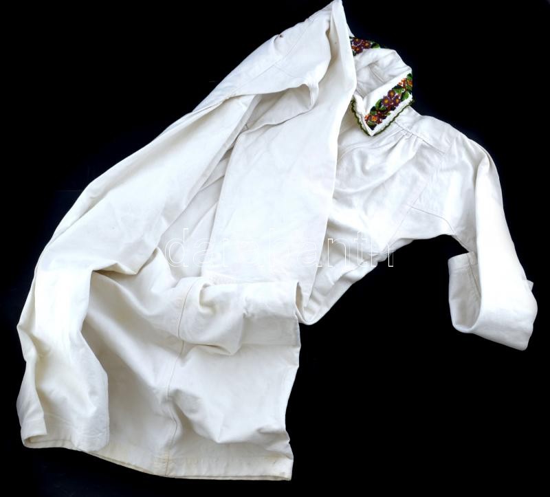 Leírás: Népies hímzett vászon öltözet, gyöngyös hímzett gallérral