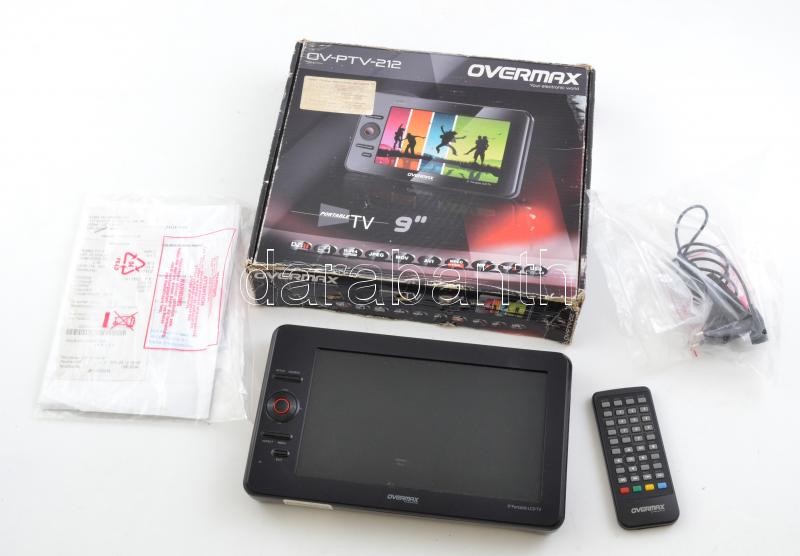 Leírás: Overmax 9" (23 cm) képátlójú hordozható LCD TV, tartozékaival, eredeti, sérült dobozában, működik, típus: OV-PTV-212