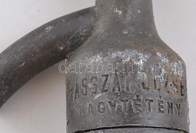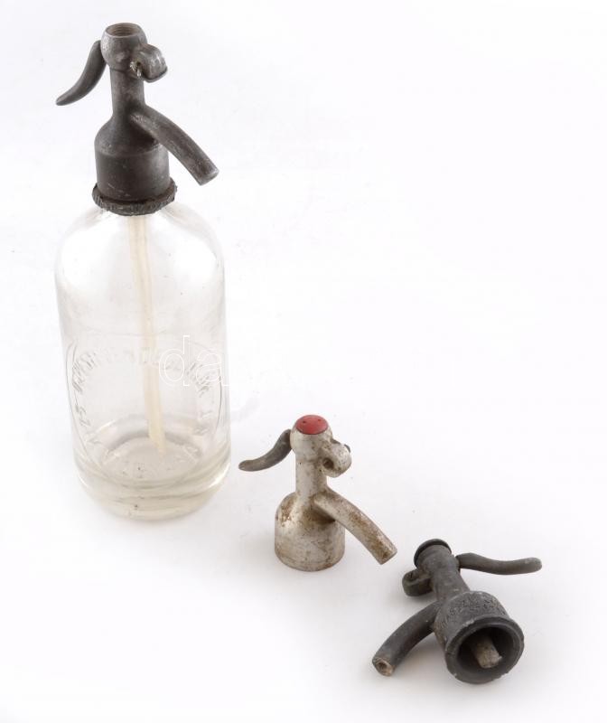 "Újpesti Vendéglősök Szikvízgyára Rt." feliratos régi, dombornyomott szódásüveg, 0,5 l, ón fejjel, m: 27 cm + 2 db szódásüveg fej: egy ón fej Kont Oszkár Bp., 1930 jelzéssel, Hasszán József Nagytétény felirattal; egy alumínium, jelzés nélkül. Koruknak megfelelő állapotban.