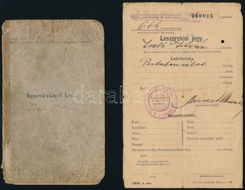 1939-1940 Katona igazolványi lapja, benne leszerelési jeggyel, a "M. K... https://www.darabanth.com/hu/424-Gyorsarveres/424.0/Mutargy-papirregiseg-egyeb/Militaria~500029/1939-1940-Katona-igazolvanyi-lapja-benne-leszerelesi-jeggyel-a-M-Kir-Alsodabasi-5-Honved-K~II2701114