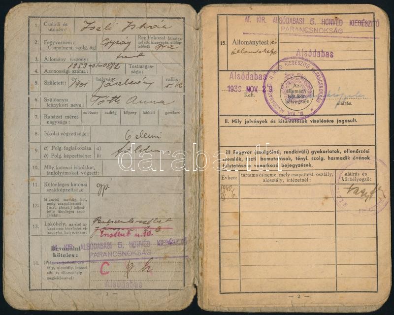 Leírás: 1939-1940 Katona igazolványi lapja, benne leszerelési jeggyel, a "M. Kir. Alsódabasi 5. Honvéd Kiegészítő Parancsnokság" bélyegzéssel,