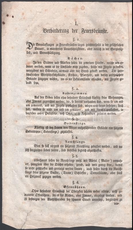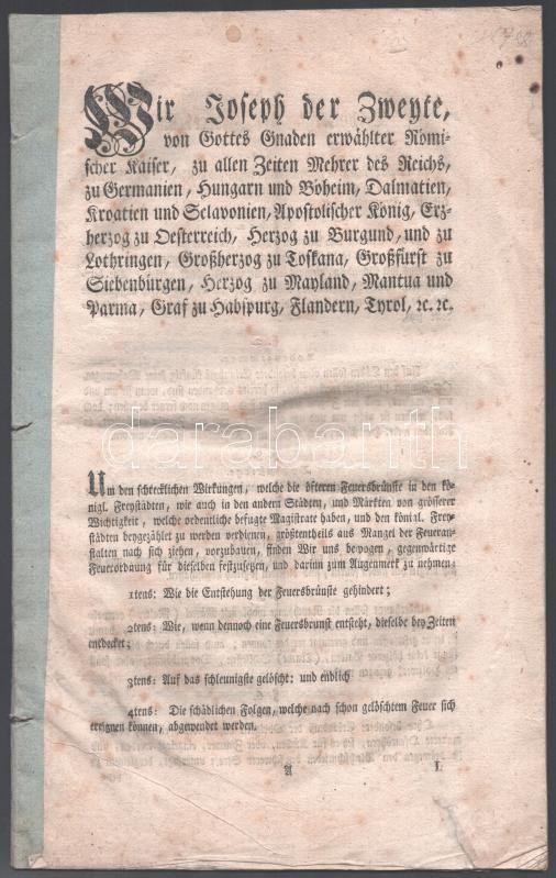 1788 Buda, II. József német-római császár, osztrák és magyar uralkodó a tűzesetek megelőzésével kapcsolatos rendelkezéseinek hirdetménye, német nyelven, kissé foltos, (28) p.