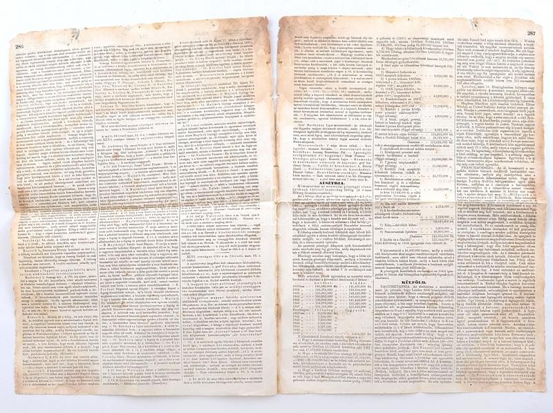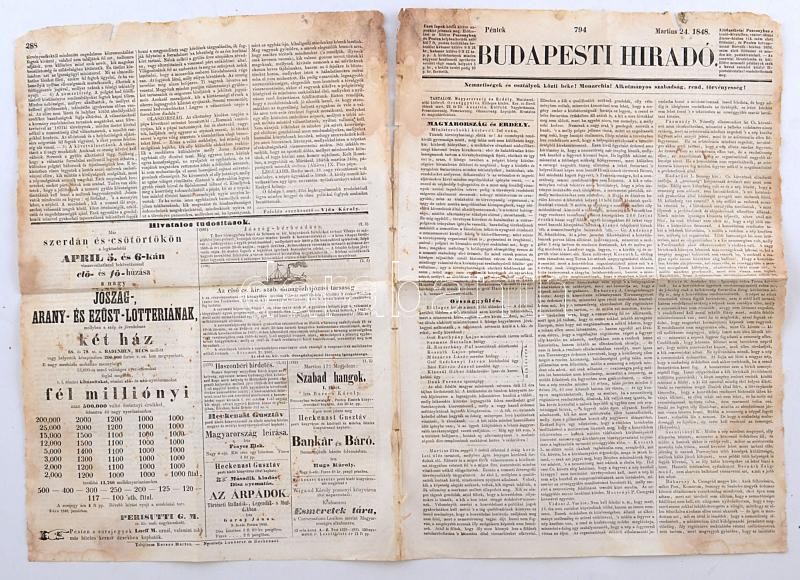 1848 Budapesti Híradó 1848. márc. 24., a címlapon: Ministerelnöki körlevél, első szám. Szerk.: Vida Károly. Pest, Landerer és Heckenast, szakadt, foltos, 285-288 p.