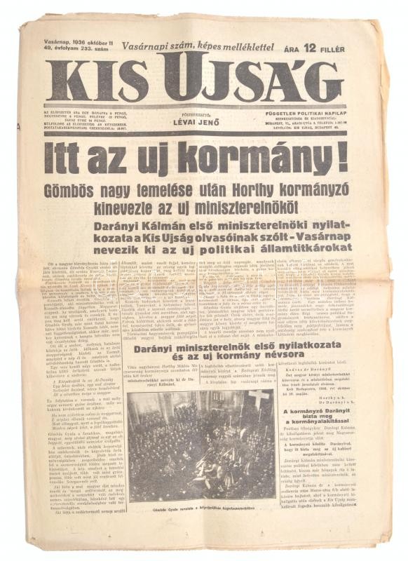 1936 Kis Ujság. 1936. okt. 11. 49. évf. 233. szám: Itt az új kormány. "Gömbös nagy temetése után Horthy kormányzó kinevezte az uj miniszterelnököt. (Darányi Kálmán.)" Szerk.: Lévai Jenő. + Képes Családi Lapok. A Kis Ujság vasárnapi melléklete. X. évf. 42. sz. Globus, 12+VIII p.