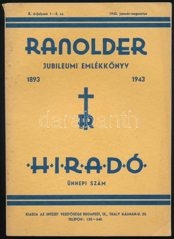 1943 Ranolder Hiradó, Jubileumi emlékkönyv, 1893-1943. X. évf., 1-3. s... https://www.darabanth.com/hu/424-Gyorsarveres/424.0/Mutargy-papirregiseg-egyeb/Nyomtatvanyok~2000002/1943-Ranolder-Hirado-Jubileumi-emlekkonyv-1893-1943-X-evf-1-3-sz-1943-januar-augusztu~II2650803